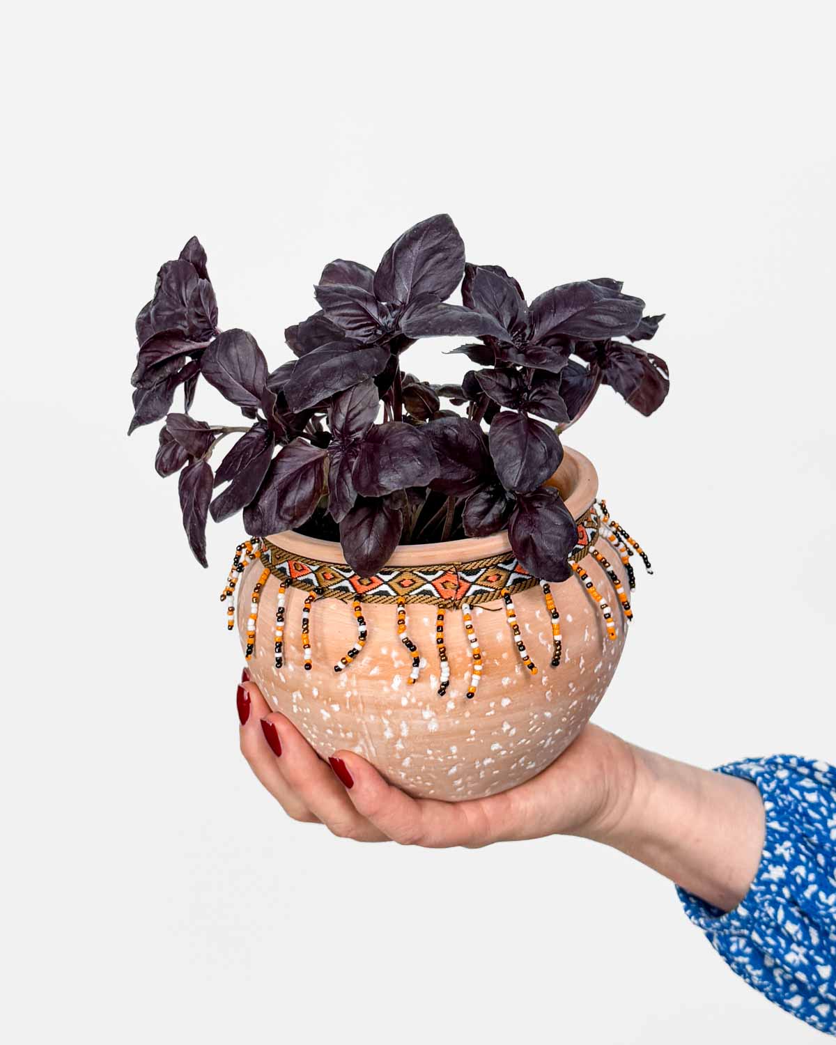Jsem tmavá, elegantní varianta jedné z nejznámějších bylinek – bazalky pravé. Moje listy mají sytě purpurovou až téměř černou barvu, která dodá tvé domácnosti nádech exotiky. A nejen že vypadám skvěle – jsem také jedlá, takže moje aromatické lístky můžeš bez obav využít v kuchyni.