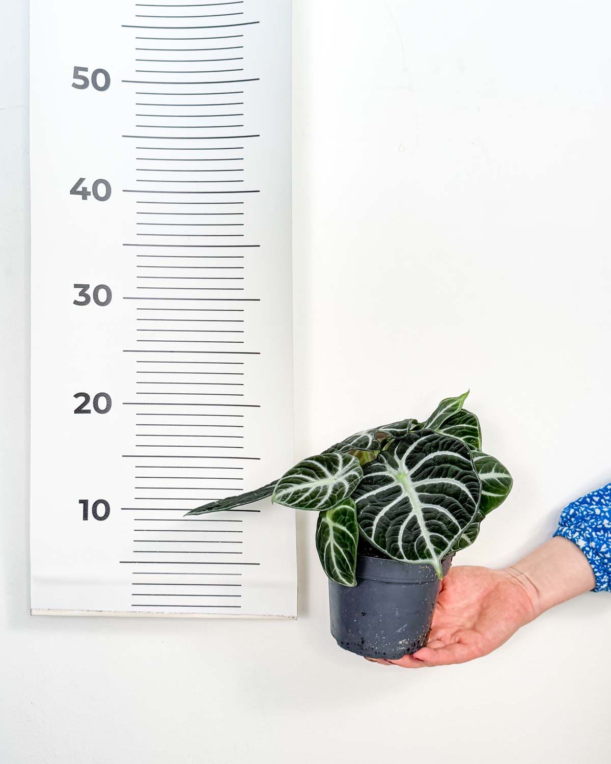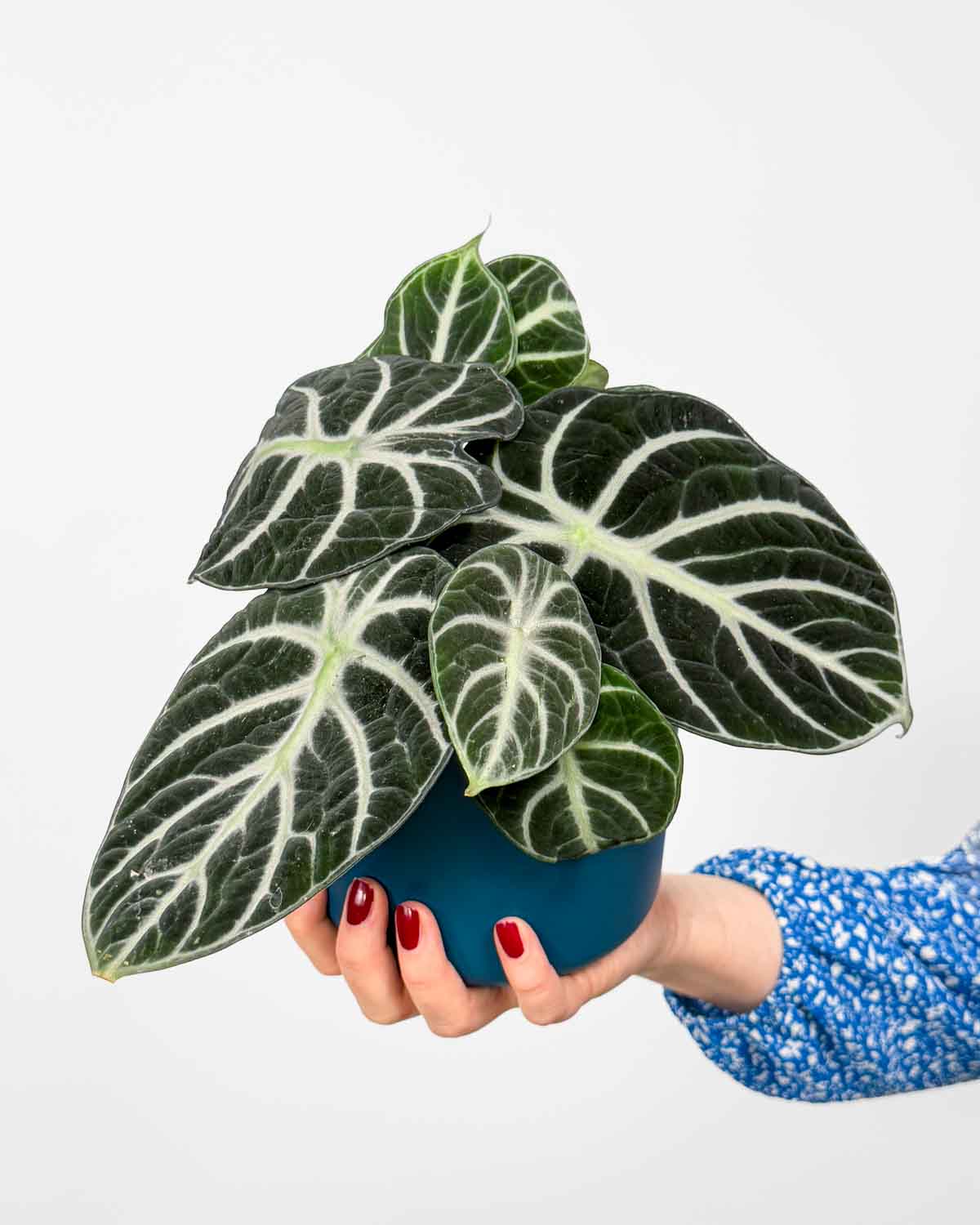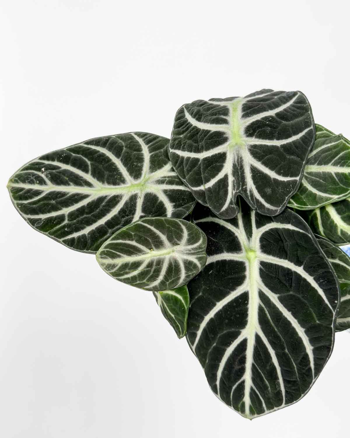 Jsem Alokázie ‚Ninja‘ (Alocasia reginula), velmi podobná své elegantní příbuzné Alocasia ‚Black Velvet‘, ale mé listy jsou o něco menší a kulatější. I přesto si mě s ní snadno spleteš – obě se pyšníme sametově tmavými listy s výrazným světlým žilkováním, které zaujme na první pohled.