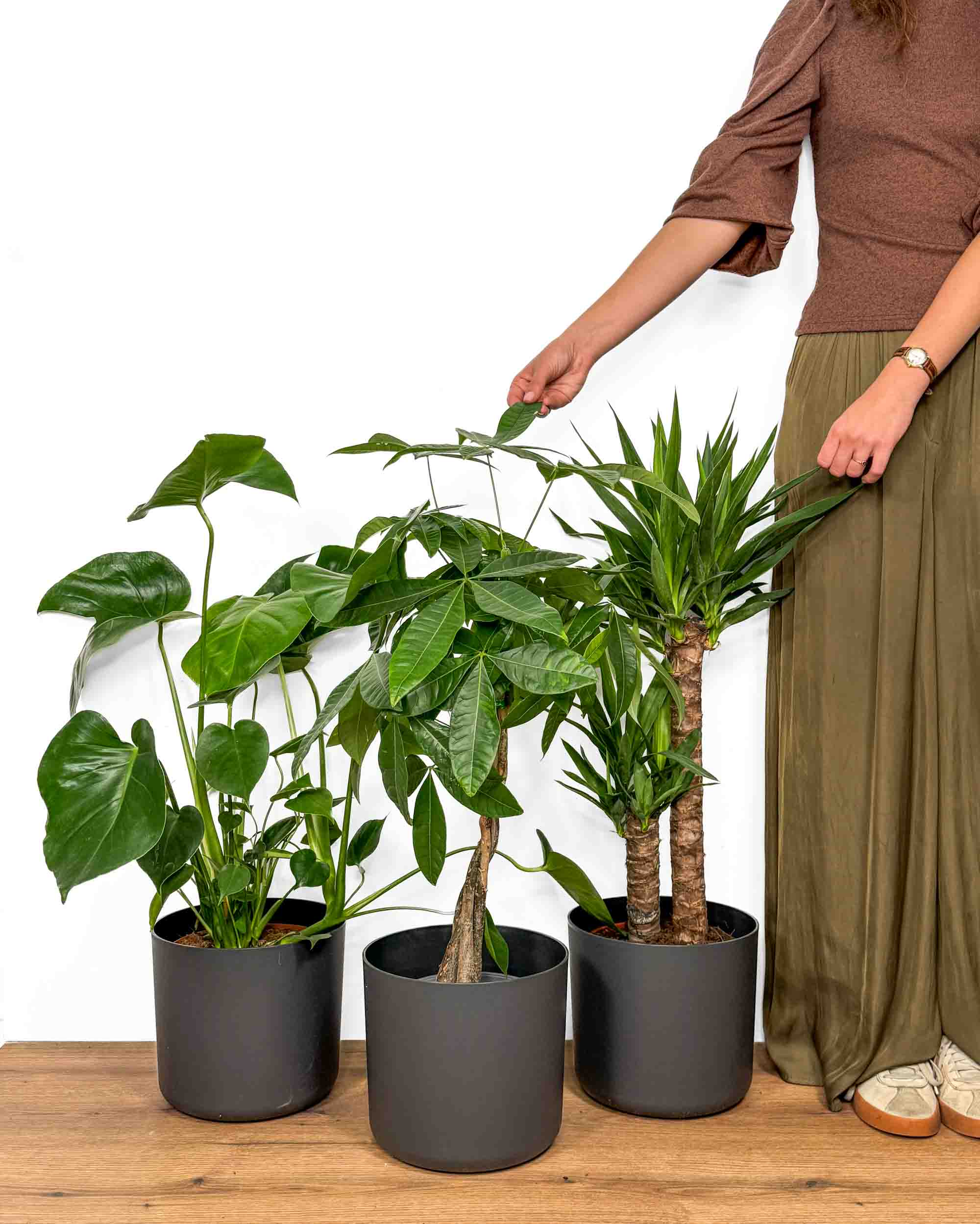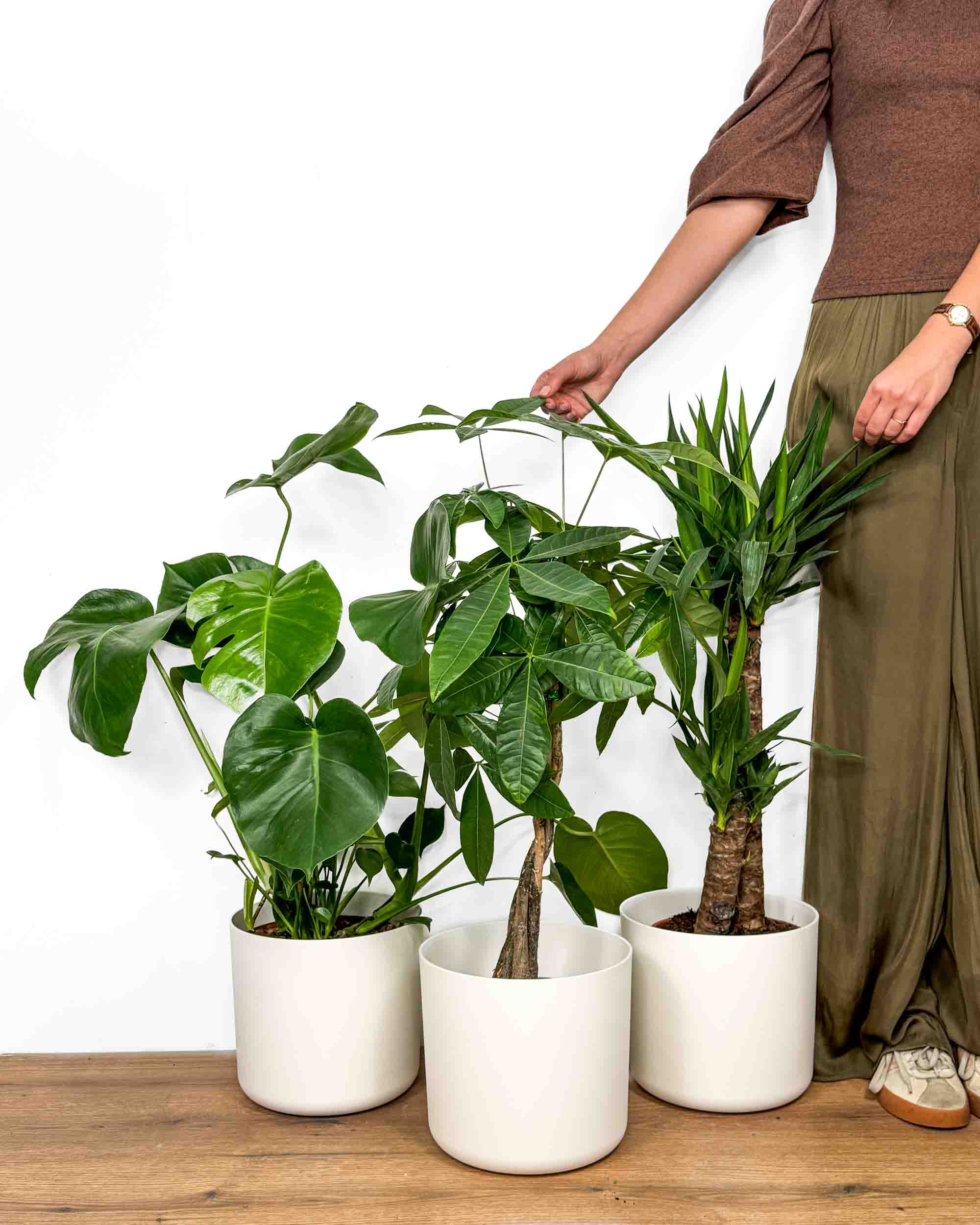 Jsem balíček ‚Zelená kancelář‘ XL – pečlivě vybraný komplet tří velkých a nenáročných pokojových rostlin, které jsou ideální pro ozelenění každé kanceláře. V balíčku obdržíš náhodné rostliny, protože výběr závisí na našich skladových zásobách. Každá rostlina je v dekorativním květináči o průměru 34 cm, který si můžeš vybrat v bílé nebo antracitové barvě. Ideální pro kanceláře, kde chceš více zeleně bez starostí!