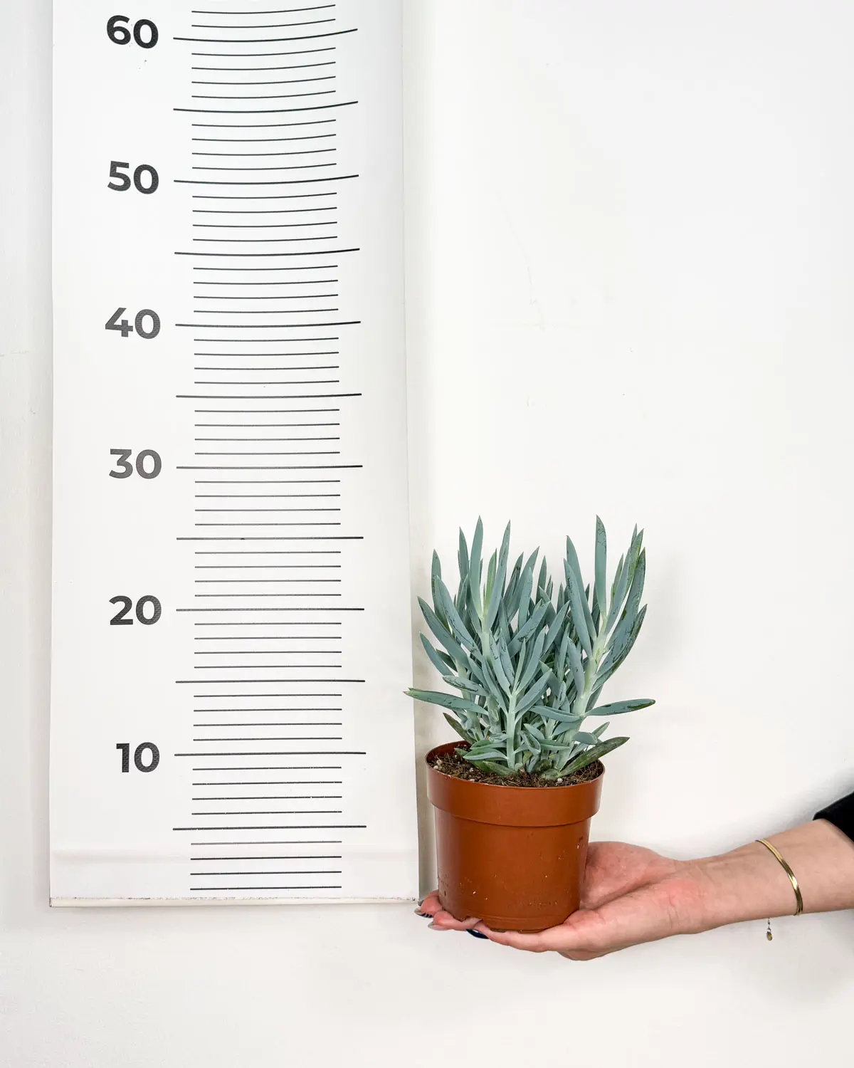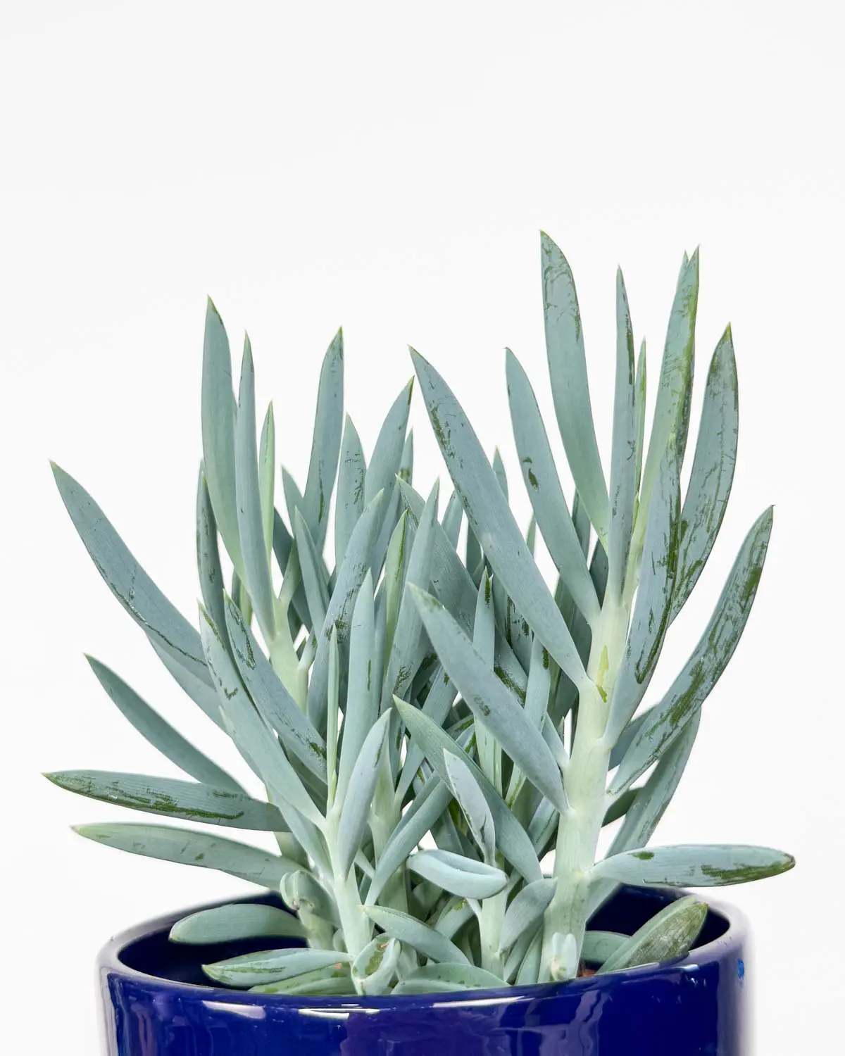 I am Curio ‚Blues‘, also known as Blue Chalksticks – which translates to „blue chalk sticks“. My fleshy, cylindrical leaves covered in a blue-gray waxy coating give me a modern and elegant look that fits into any interior, even a sunny windowsill.