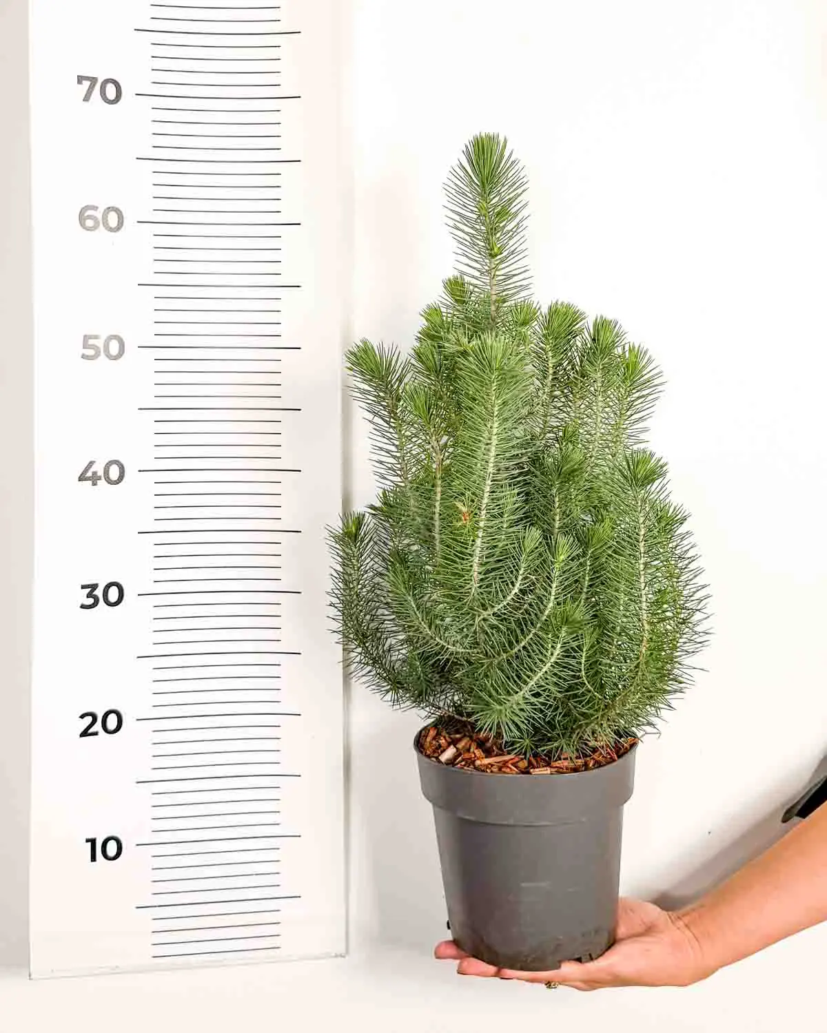 Jsem Borovice pinie ‚Silver Crest‘ (Pinus pinea), elegantní verze středomořské pinie, která se také nazývá italská nebo středomořská borovice. Protože pocházím z oblasti Středomoří, vůbec mi nevadí, když mě máš jako pokojovou rostlinu, zároveň mě můžeš mít i venku! Jsem obzvláště oblíbená v zimních měsících, kdy mě můžeš ozdobit jako vánoční stromek. Venku mohu dorůst až do výšky 10 m a šířky 4 m, ale v pokojových podmínkách budu mnohem menší.