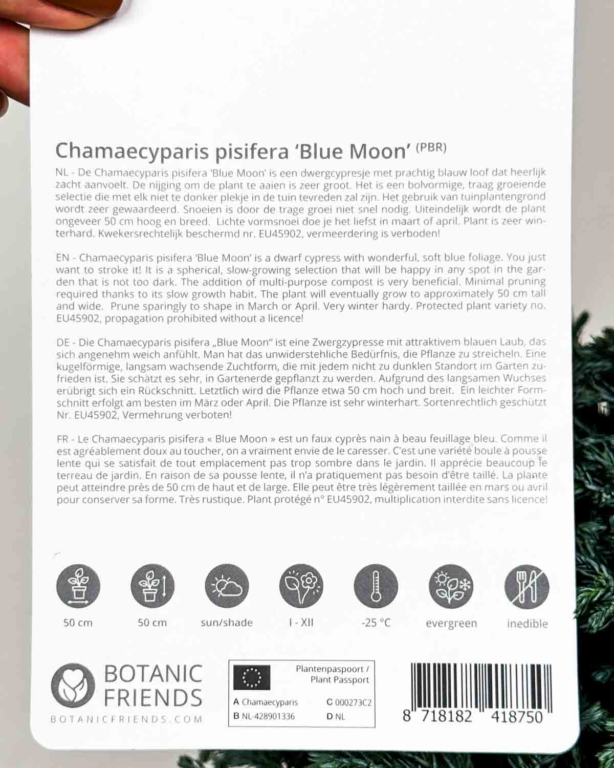 Jsem Cypřišek hrachonosný ‚Blue Moon‘ (Chamaecyparis pisifera), a své jméno jsem získal díky úžasným, stříbrno-modrým jehlicím. Jsem velmi odolný a elegantní, jehlice si udržuji po celý rok! Dorůstám maximálně do jednoho metru na výšku a šířku.