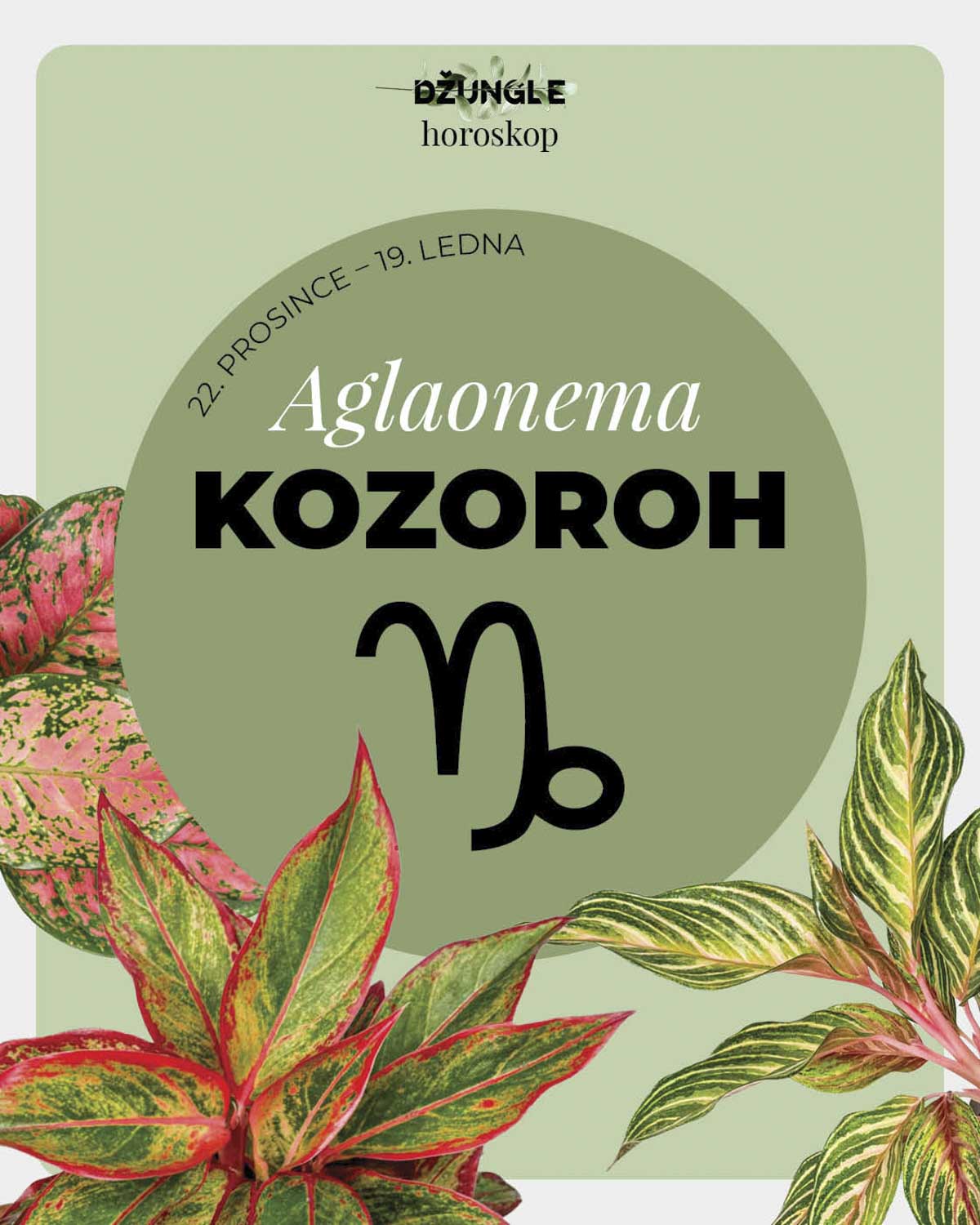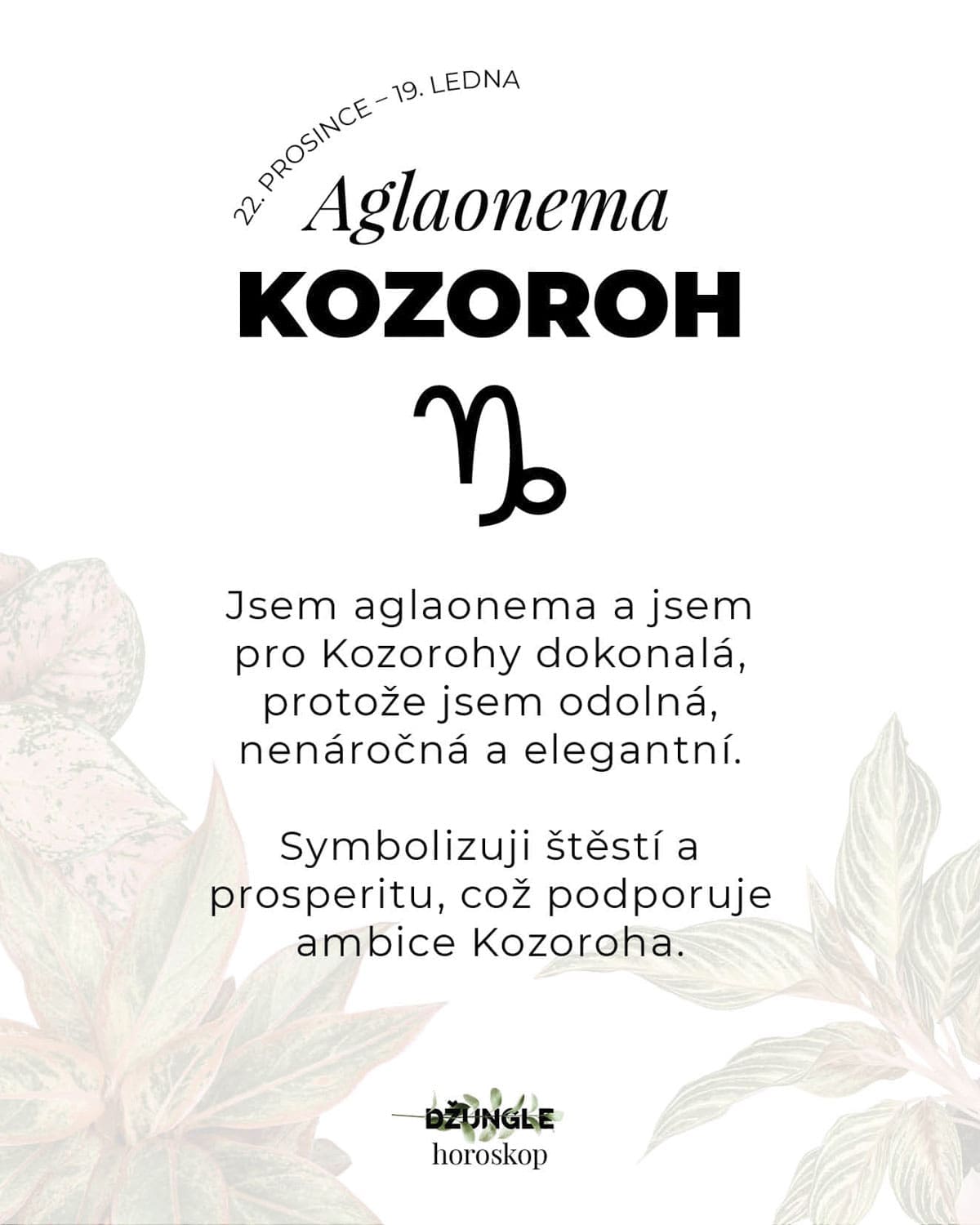 Jsem aglaonema a jsem pro Kozorohy dokonalá, protože jsem odolná, nenáročná a elegantní. Symbolizuji štěstí a prosperitu, což podporuje ambice Kozoroha.