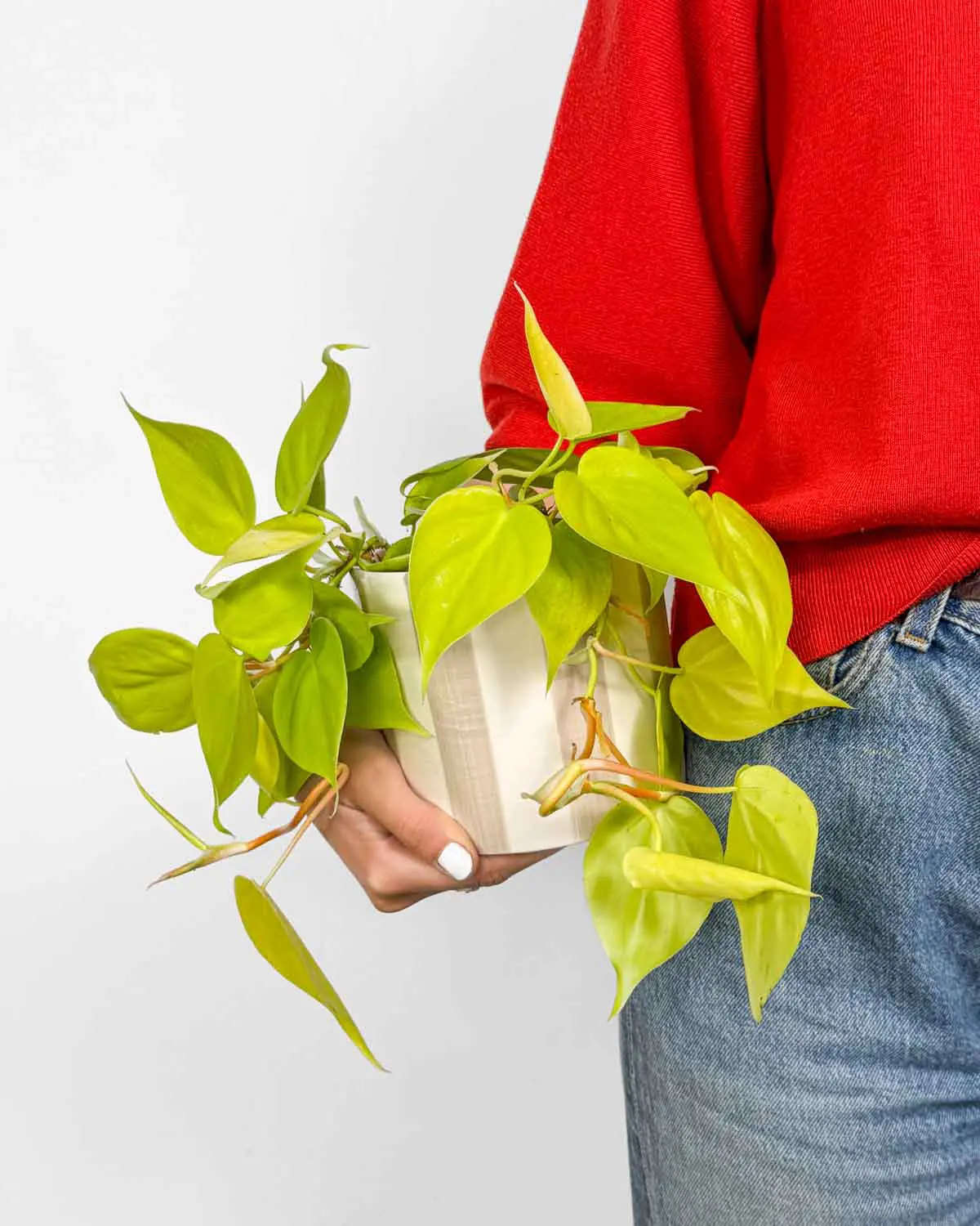 Jsem Filodendron ‚Lime‘ (Philodendron scandens) a mám charakteristické listy ve tvaru srdce, proto mě také nazývají ‚Sweetheart Plant‘ – pokud bys náhodou chtěl/a někomu něco sdělit 😉 Jinak jsem na péči poměrně nenáročná rostlina, za zajištěných podmínek rychle rostu a inspiruji tě stále novými lístky. Jsem popínavka, proto se mi daří jak v závěsném květináči, nebo mohu růst do výšky u opory nebo zdobím tvé stěny, pokud mě nasměruješ.