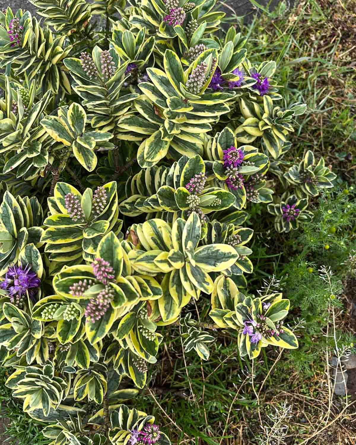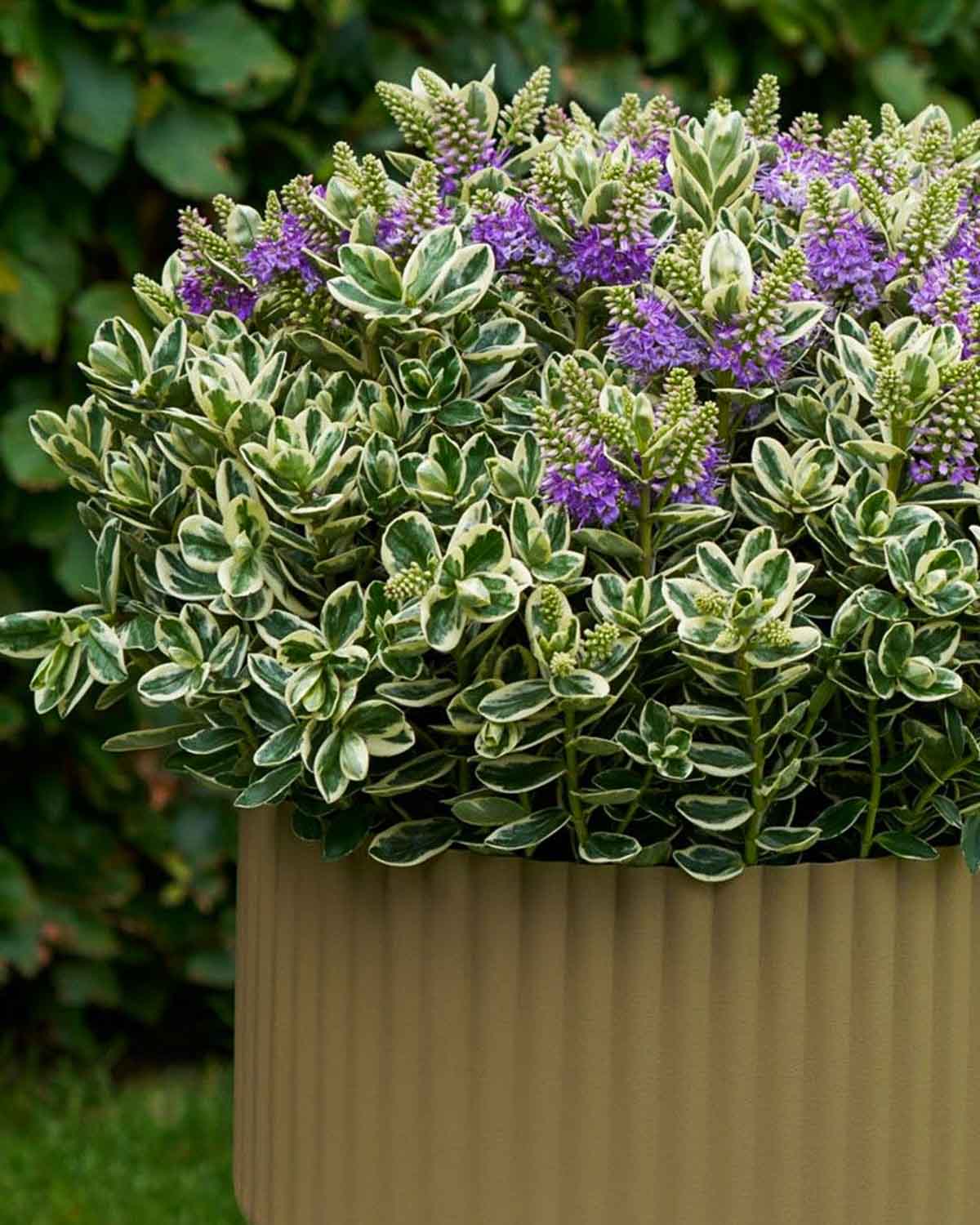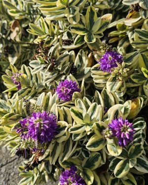 Jsem Hebe ‚Tricolor‘ (Hebe speciosa), stálezelený keřík s pestrými listy a fialovými letními květy, který každé zahradě dodá trochu středomořského šarmu. Jsem zcela nenáročná a s radostí zdobím slunné koutky balkonu nebo zahrady po celý rok. Mohu dorůst do výšky a šířky 60 až 90 cm, konečné velikosti dosáhnu za tři roky.