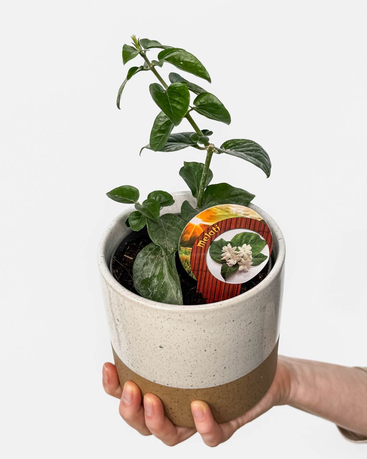 Jsem Arabský jasmín (Jasminum sambac), proslulý svými nádhernými bílými květy a intenzivní vůní, která je často základem těch nejlepších parfémů. Mohu růst jako keř nebo popínavka a své květy ti nabídnu po celé léto! Dorůstám do výšky 3 metrů a šířky 2 metrů, přičemž své konečné velikosti dosáhnu za 2–3 roky.
