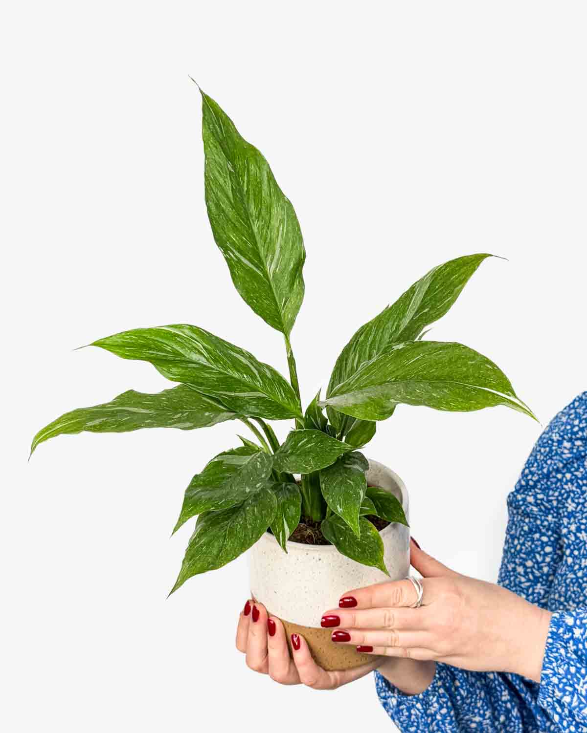 Vidíte ty moje roztomilé bílé skvrny? Jako by mě někdo zkrášlil náhodnými tahy štětcem. Jsem velmi elegantní rostlina, stejně jako ostatní druhy spatfylů, s dlouhými kopinatými listy, které jsou několikrát do roka obohaceny bílými květy. V této pestré verzi jsem ještě jedinečnější. Jakmile se však dostanu do vašeho domova, postarám se o něj z estetického i fyzikálního hlediska – odstraním ze vzduchu škodlivé látky a zároveň ho zvlhčím.