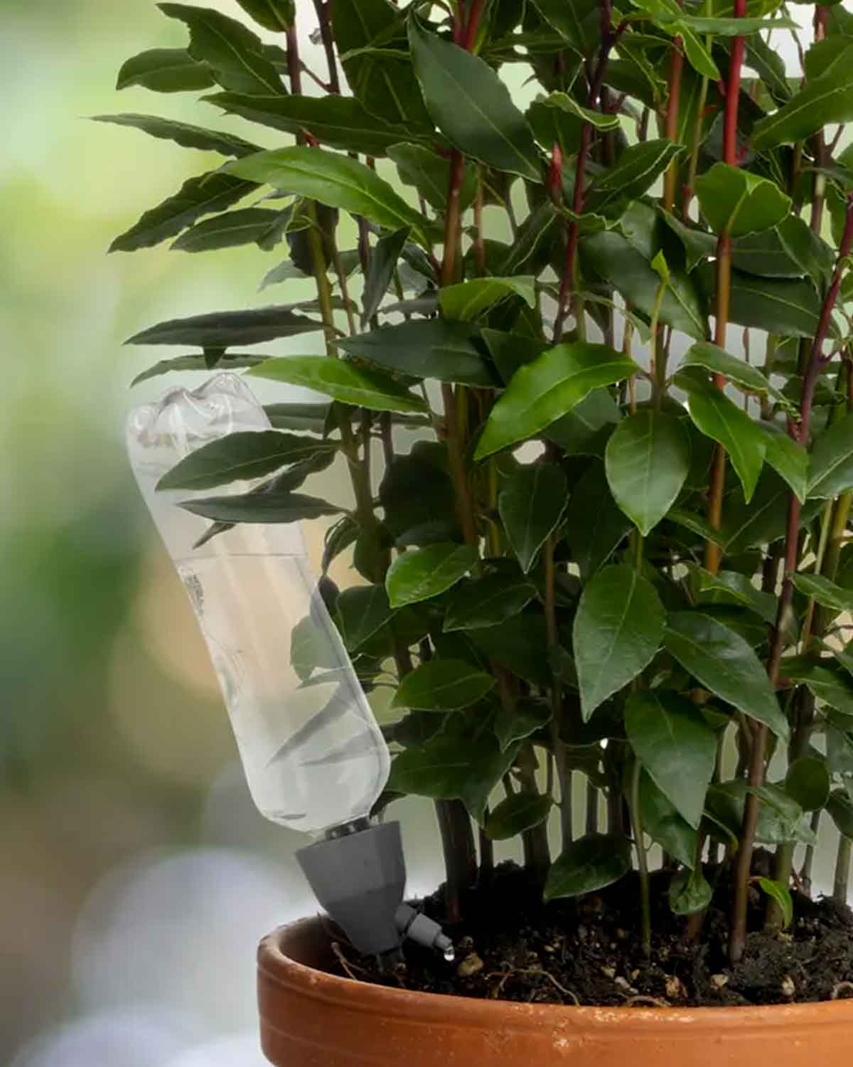 Nástavec pro kapkové zavlažování je jednoduché a chytré řešení, jak zajistit rostlinám dostatek vody i v době, kdy nemáš čas na pravidelnou zálivku. Funguje tak, že naplníš láhev vodou, našroubuješ na ni nástavec, otočíš ji vzhůru nohama a zapíchneš do půdy vedle rostliny.