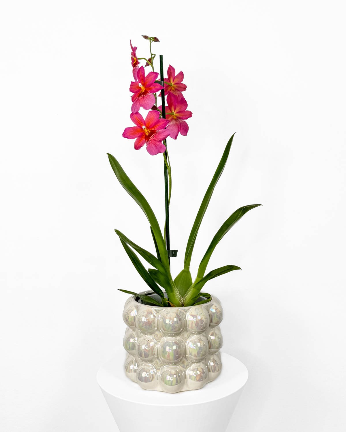 Jsem orchidej ‚Cambria Nelly Isler‘ (Oncidopsis), nádherná a jedinečná díky svým pestrým a rozmanitým květům, které rozzáří každý prostor.