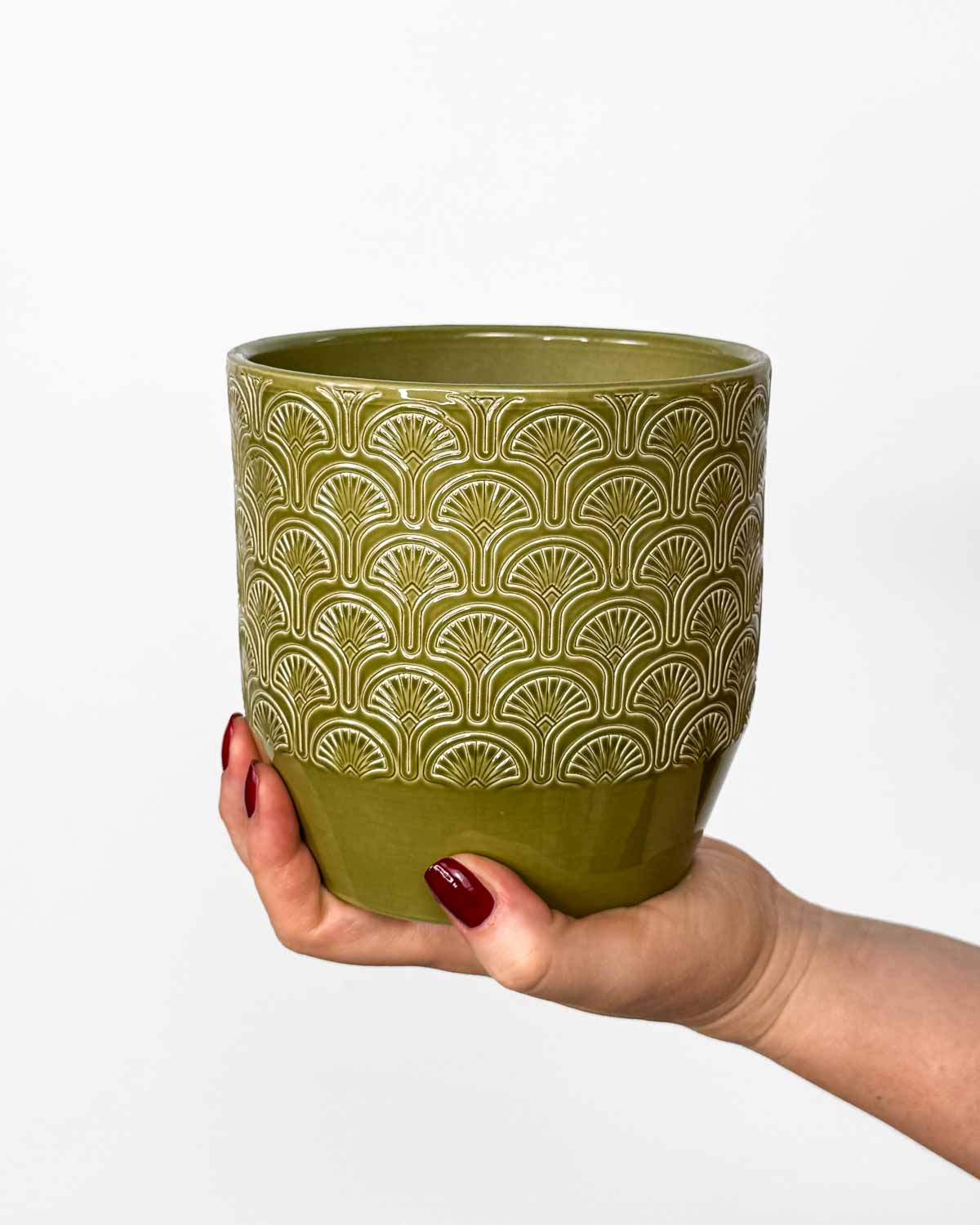 Páv květináč je dekorativní keramický květináč o průměru 12 cm a výšce 14 cm, který zaujme bohatou zelenou barvou a reliéfním vzorem, který připomíná ptačí peří. Díky svému designu se skvěle hodí k rostlinám s výraznými listy nebo barevnými stonky, protože vytváří krásné kontrastní pozadí. Protože je vyroben z keramiky, je těžší a stabilní, takže je ideální pro rostliny s bujnějším růstem nebo závěsné rostliny, které potřebují stabilní květináč. Uvnitř nemá odtokový otvor, proto doporučujeme použití plastového sázecího květináče.