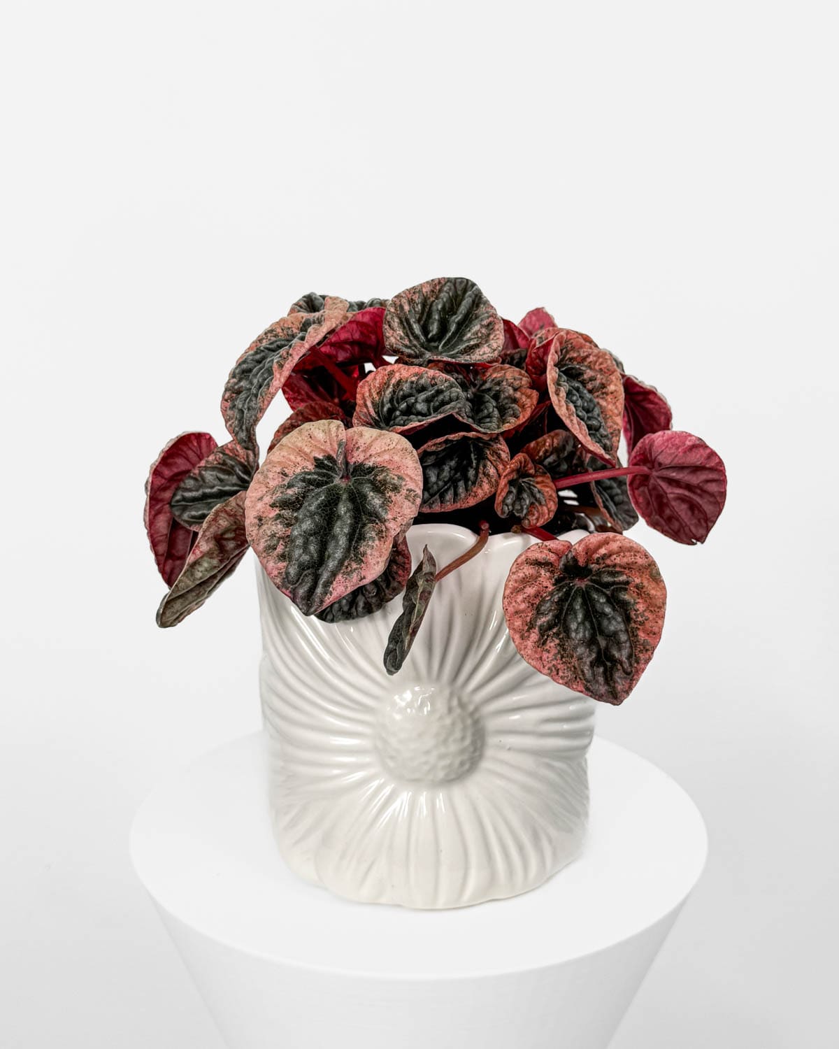 Jsem Peperomie ‚Abricos‘ (Peperomia caperata) a poznáš mě podle zvrásněných, masitých listů v krásných barevných odstínech. Právě díky nim jsem si vysloužila přezdívku radiator plant.