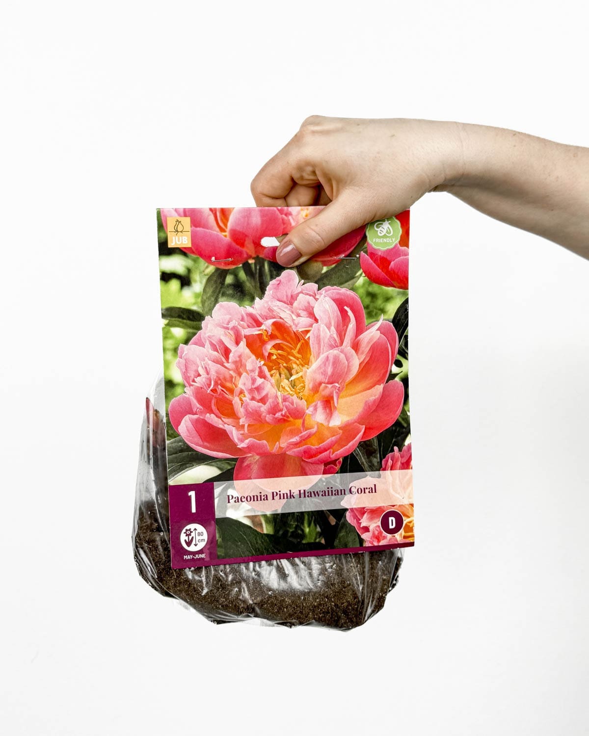 Jsem hlíza pivoňky ‚Pink Hawaiian Coral‘ (Paeonia), kterou vypěstoval Jub. Za kvalitu ručím, pokud se budeš řídit pokyny na obalu.