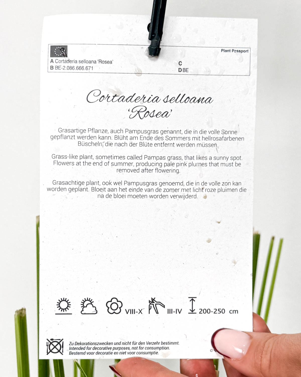 Ahoj, dovol mi se představit – jsem Růžová pampová tráva (Cortaderia selloana ‚Pink feather‘)! Pampové trávy existujeme, abychom zkrášlily svět kolem sebe. Často nás přidávají do květinových aranžmá a vybírají pro dekoraci v bytě. Vždy nadchneme. Protože jsem v této verzi růžové barvy, udělám ještě větší dojem, protože jsem prostě nádherná. Kvetu pozdě v létě nebo na podzim. Pokud mě nyní zasadíš, vykvetu ti za 2 – 3 roky. Není nutné, aby můj první květ byl růžový, protože potřebuji čas, abych dosáhla svého plného potenciálu.