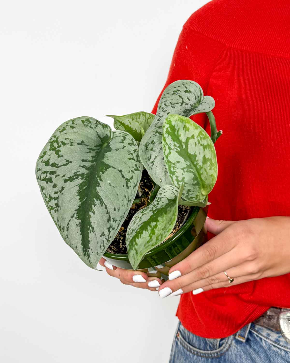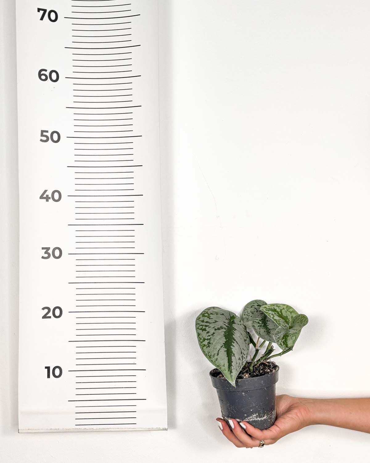 Jsem Satin Potos ‚Trebie‘ (Scindapsus pictus), známý také jako šplhavnice stříbrná. Pyšním se srdčitými listy v tmavě stříbrném odstínu, které zdobí jemné zelené vzory. Pokud mě umístíš na teplé stanoviště a nebudeš mě přelévat, porostu rychle a bujně. Jako pravá popínavka se hodím do závěsného květináče, na oporu nebo mě můžeš nechat pnout po stěnách své domácí džungle.