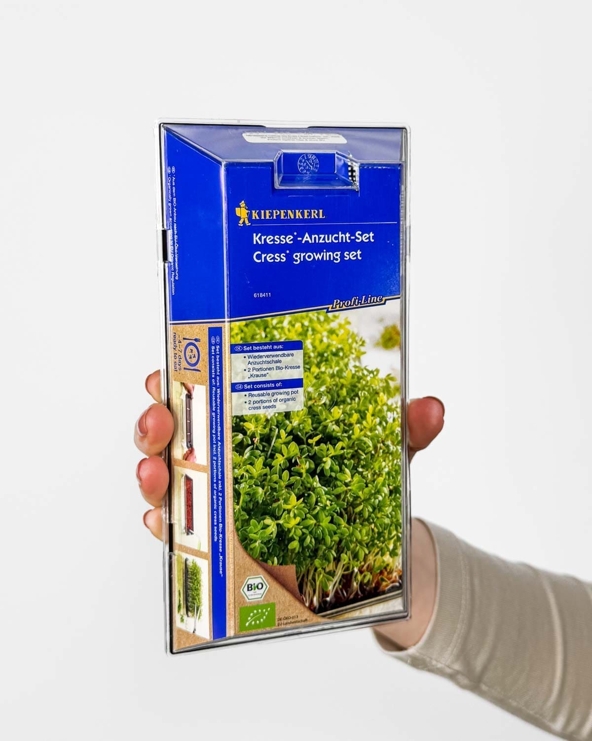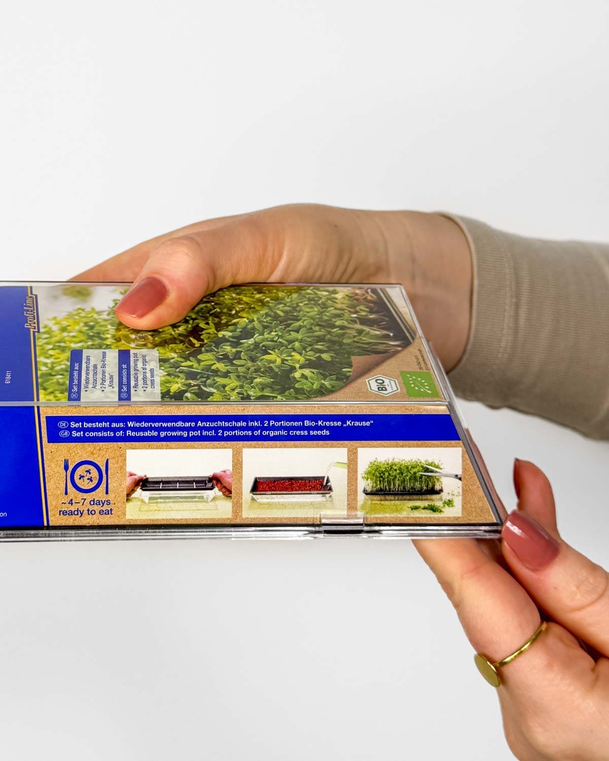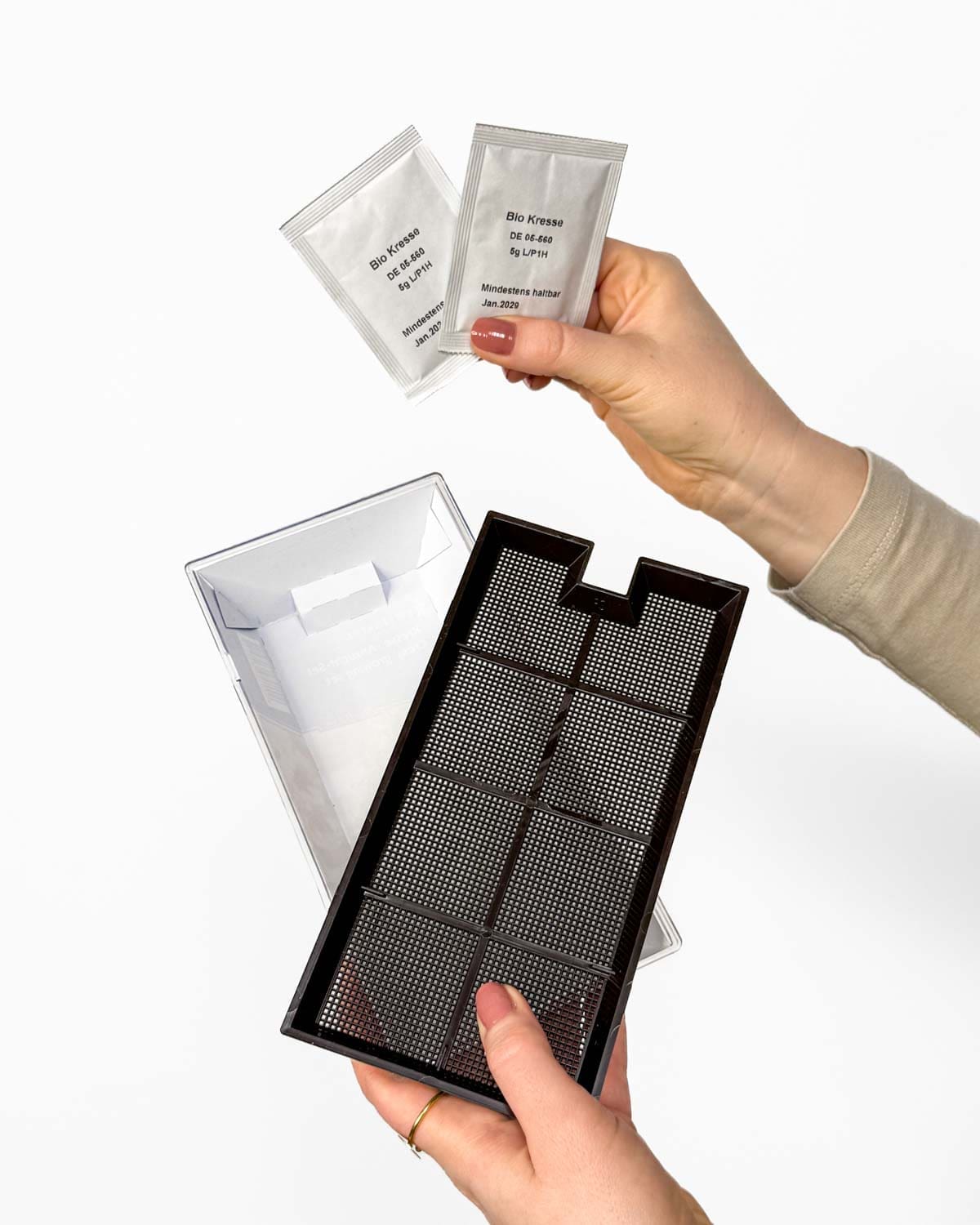 Sada pro pěstování řeřichy obsahuje pevnou krabici s mřížkou pro setí a dva balíčky BIO semen zahradní řeřichy.