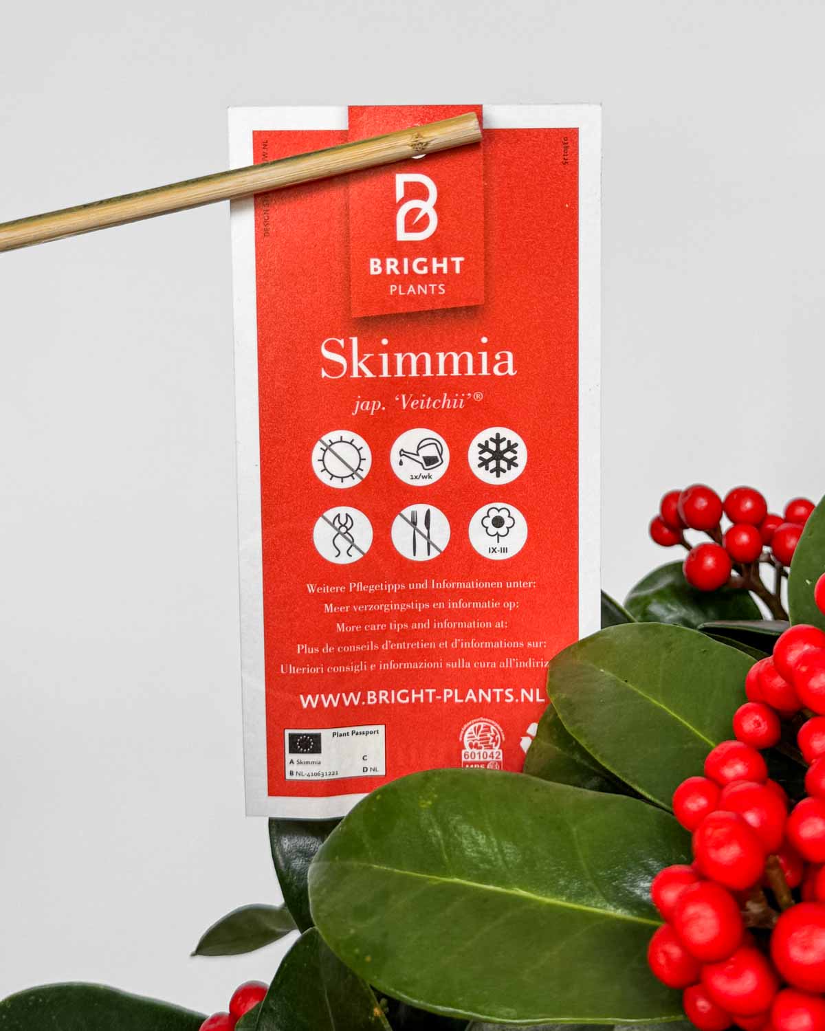 Jsem nádherná, že? 😉 Jsem stálezelená japonská skimie ‚Veitchiit‘ a každého okouzlím svými krásnými červenými bobulemi, které za přítomnosti samčí rostliny plodím každý podzim. Mohu dorůst až do výšky a šířky 1,5 metru.
