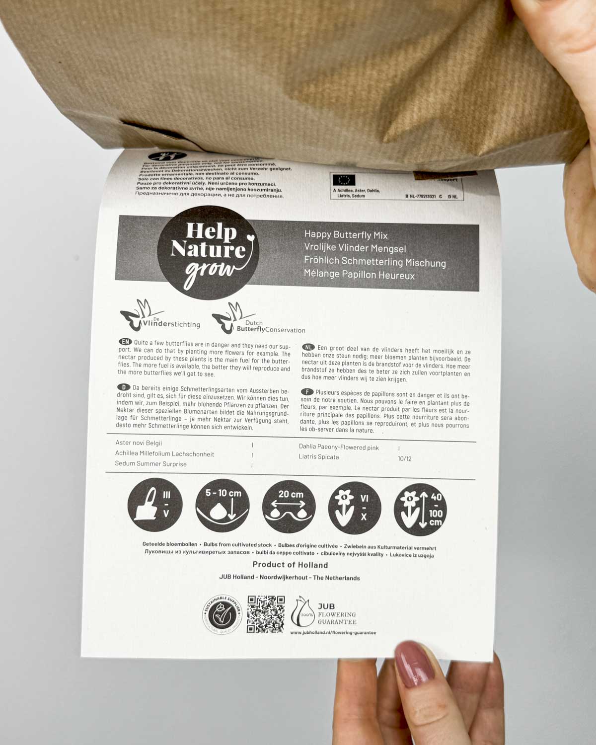 Stanoviště motýlů po celém světě ubývají a jsou stále více ohrožena. Přitom motýli hrají klíčovou roli jako opylovači – přispívají k produkci potravin i zachování biologické rozmanitosti. Tato směs květinových hlíz jim poskytne cenný zdroj nektaru a pomůže podpořit jejich populaci. Směs obsahuje 14 pečlivě vybraných květních hlíz.