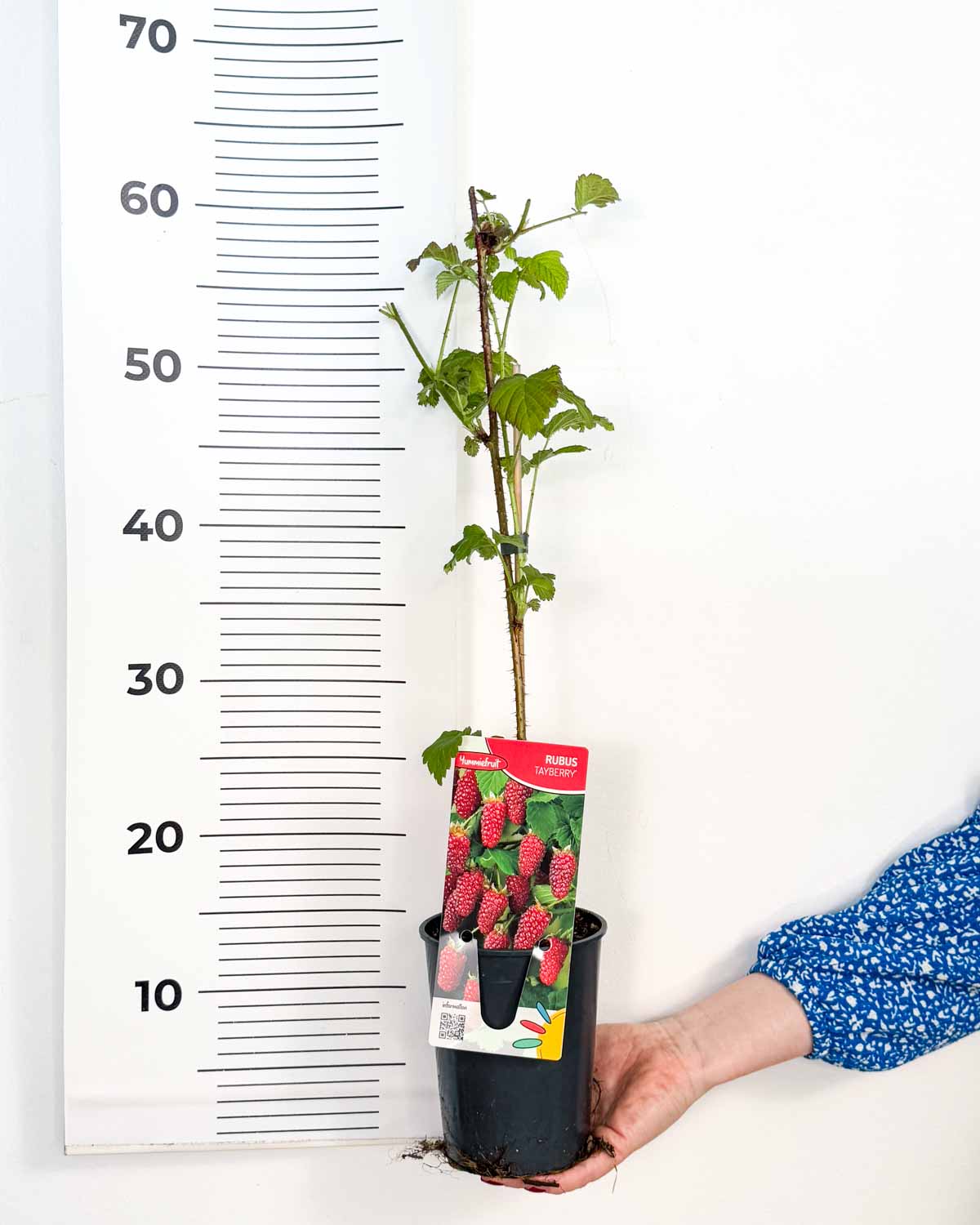 Jsem Tayberry (Rubus ‚Tayberry‘), úžasný kříženec ostružiny a maliny – spojení toho nejlepšího z obou světů! V létě tě potěším velkými, sladkými plody podobnými malinám, plnými antioxidantů. A co je na mně nejlepší? Jsem samosprašná a úplně bez trnů – takže si moje plody můžeš vychutnat bez obav z dopíchaných prstů.