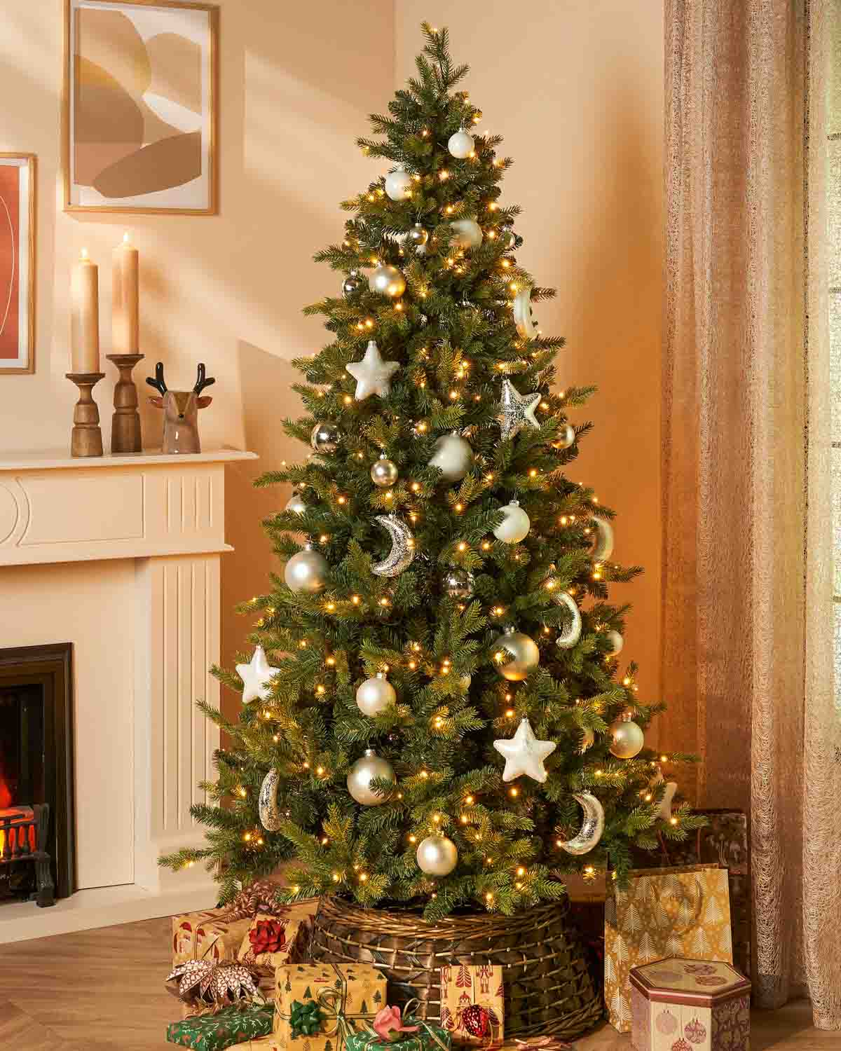 Umělý stříbrný vánoční stromek z kolekce Triumph Tree – Tuscan spojuje krásu pravého smrku a pohodlí umělého stromku. Je vysoký 155 cm a široký 100 cm, s nádherně hustou a bujnou korunou. Jeho větve jsou přirozeně hnědé barvy a pokryté měkkými PVC jehličkami, které dodávají realistický vzhled.