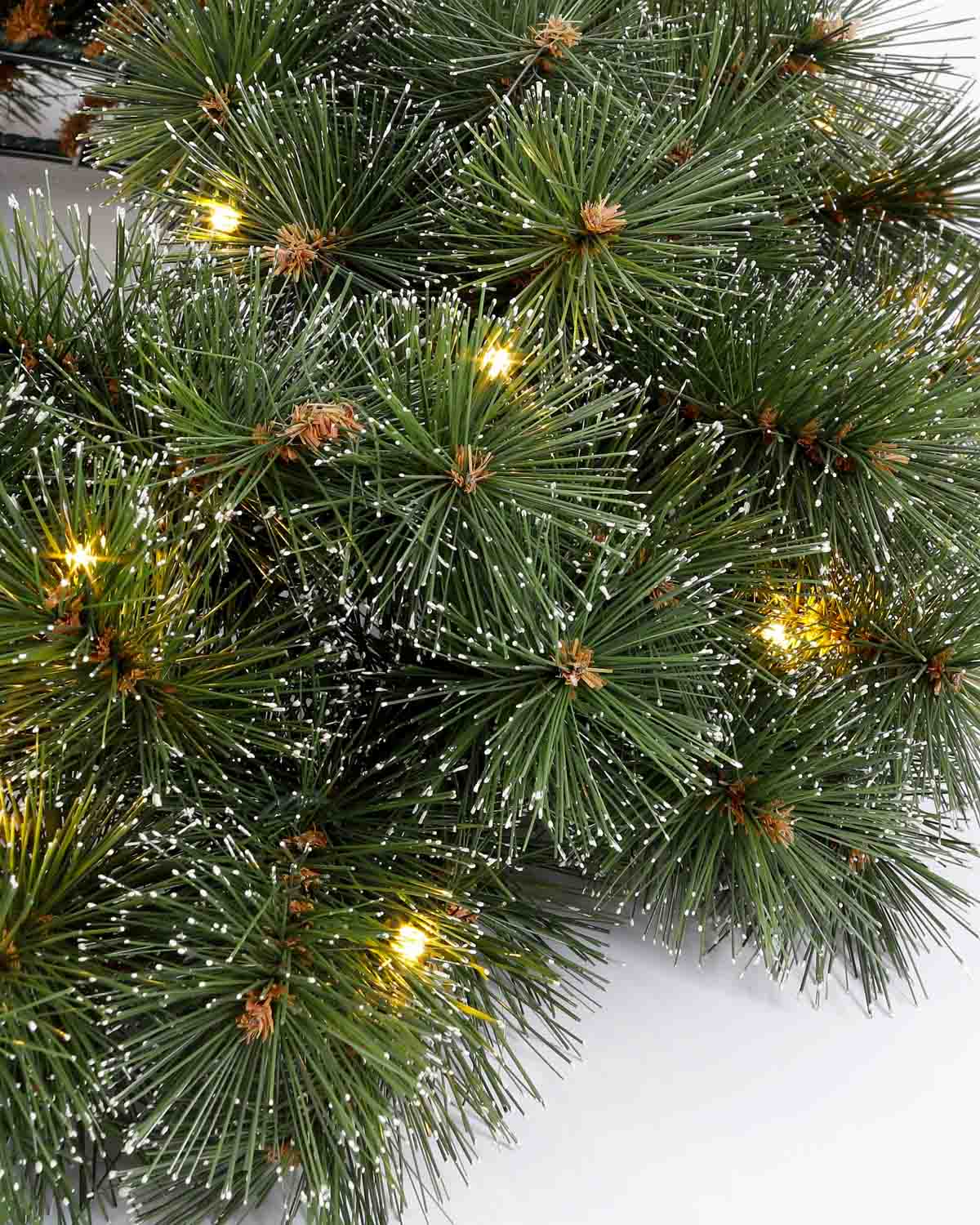 Věnec je vyroben z kvalitní směsi měkkého a tvrdého PVC jehličí (tloušťka 0,38 mm), které zajišťují realistický vzhled husté zeleně. Obsahuje 72 větviček, které vytvářejí bohatou strukturu, a LED světla v teplém bílém odstínu, jež navozují příjemné, jemné světlo. Napájení zajišťují dvě AA baterie (nejsou součástí balení), takže jej lze umístit kamkoli – bez potřeby zásuvky.