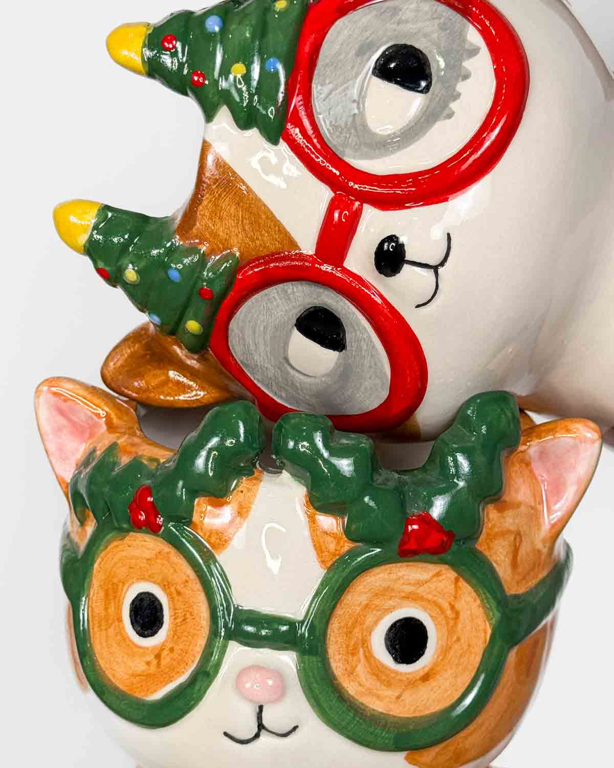 Jsem Vánoční kočičí květináč (S) – roztomilý keramický květináč, který přinese do tvého domova sváteční radost a dobrou náladu. Jsem vhodný pro menší pokojové rostliny a tak jemně vánoční, že mohu zůstat v použití i po Vánocích. Dávej pozor, abychom se se sadbovým květináčem příliš netiskli k sobě – nech mezi námi alespoň prst prostoru, abychom oba mohli normálně dýchat.