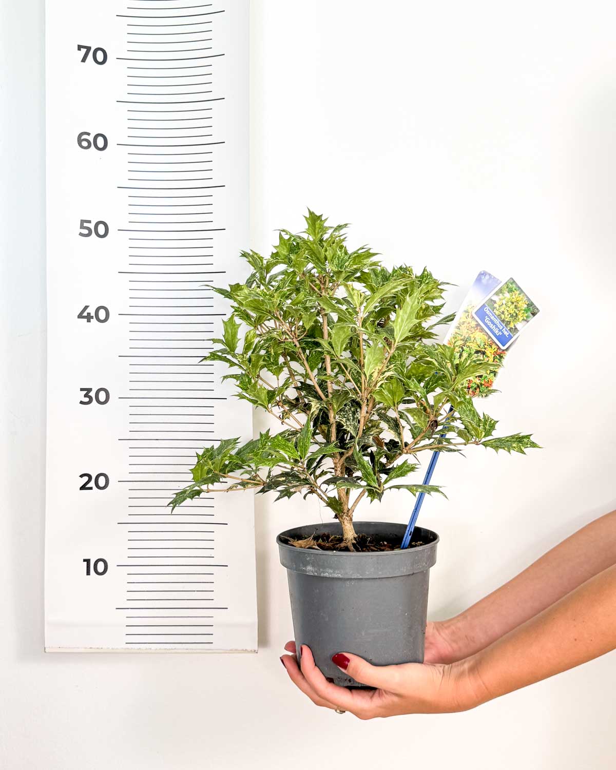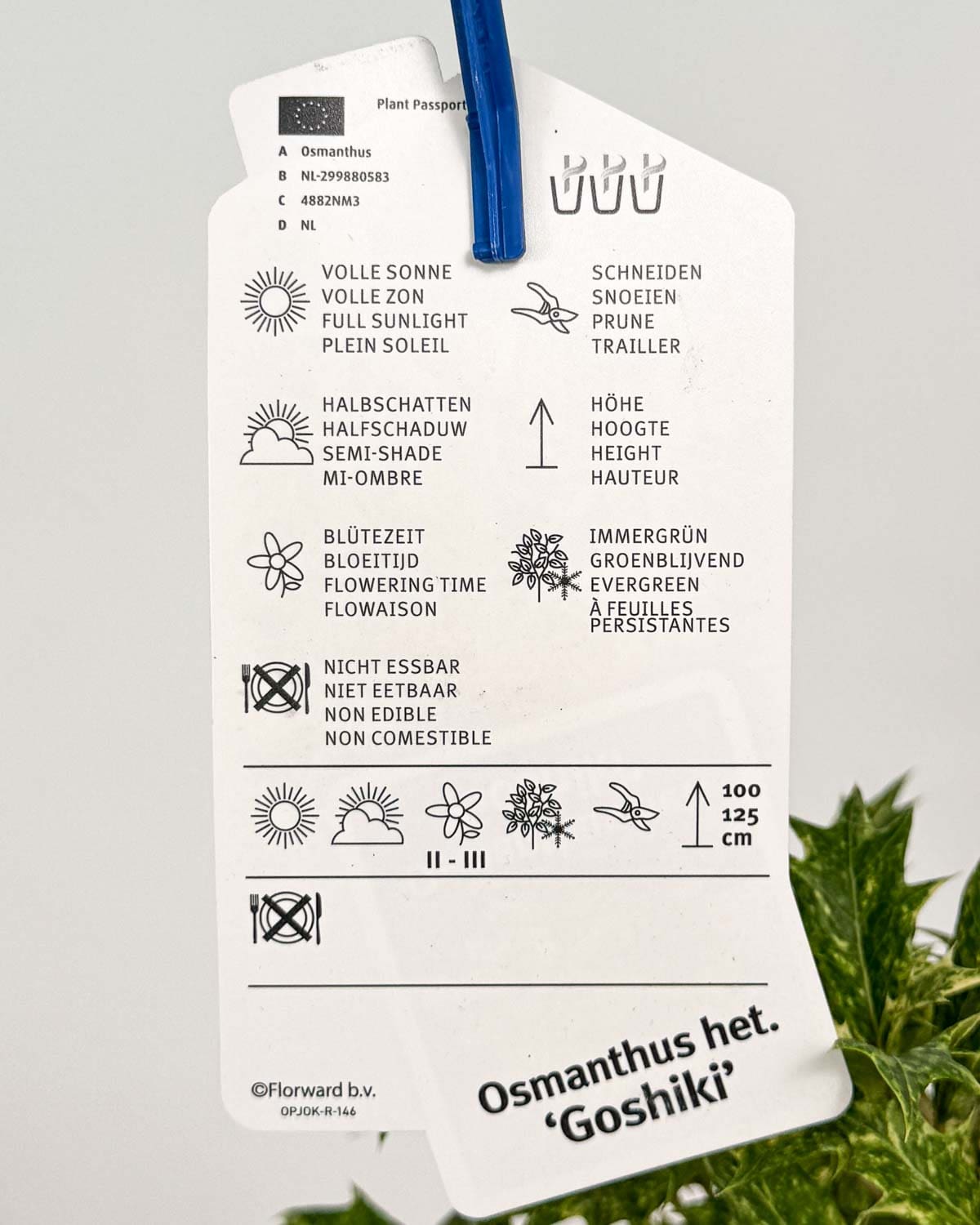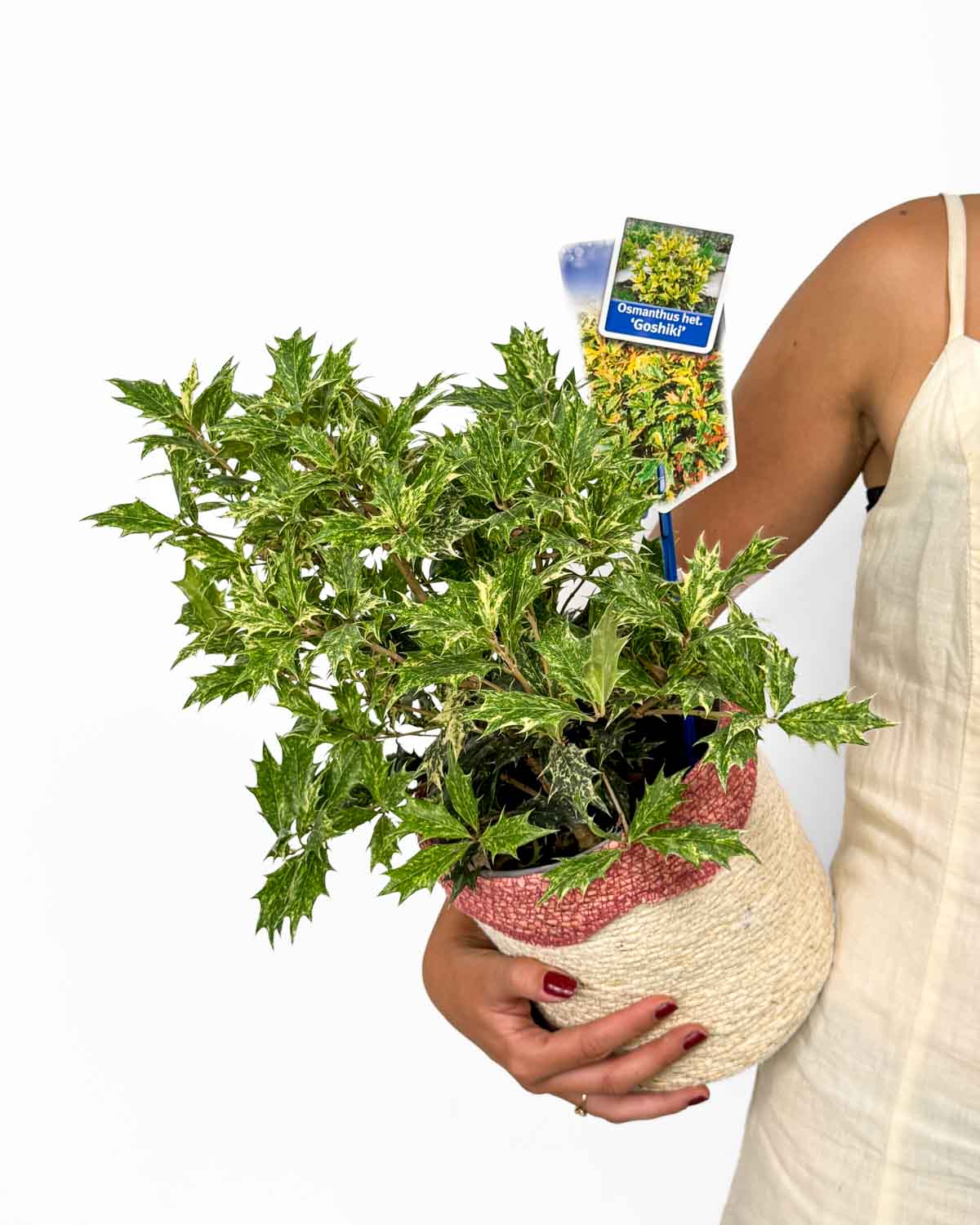 Jsem Vonokvětka různolistá ‚Goshiki‘ (Osmanthus heterophyllus), elegantní stálezelený keř s malými listy podobnými cesmíně, zbarvenými do zelených a krémových odstínů. Slovo ‚Goshiki‘ v japonštině znamená pět, což označuje rozmanitost barev, které mě zdobí po celý rok. Mohu dorůst do výšky a šířky 1 až 1,5 m, konečné velikosti dosáhnu za 10-20 let. Dobře snáším pravidelné prořezávání, takže mě někteří používají i jako živý plot.