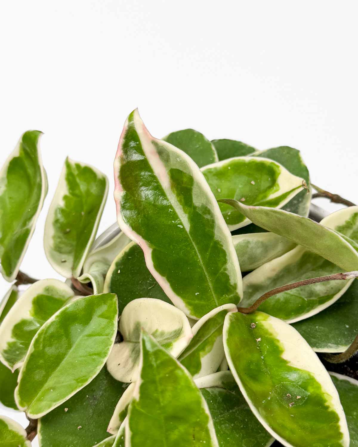 Stejně jako mé příbuzné z rodiny Hoya carnosa mám charakteristické voskovité a kompaktní listy, ale mě poznáte podle kombinace zelené a bílé nebo jemně béžové barvy na okrajích listů. Díky svému tvaru budu velmi vděčně růst i v závěsném květináči. Na jaře kvetu hvězdicovitými květy jemně růžové barvy, které mají také velmi příjemnou vůni. 🙂