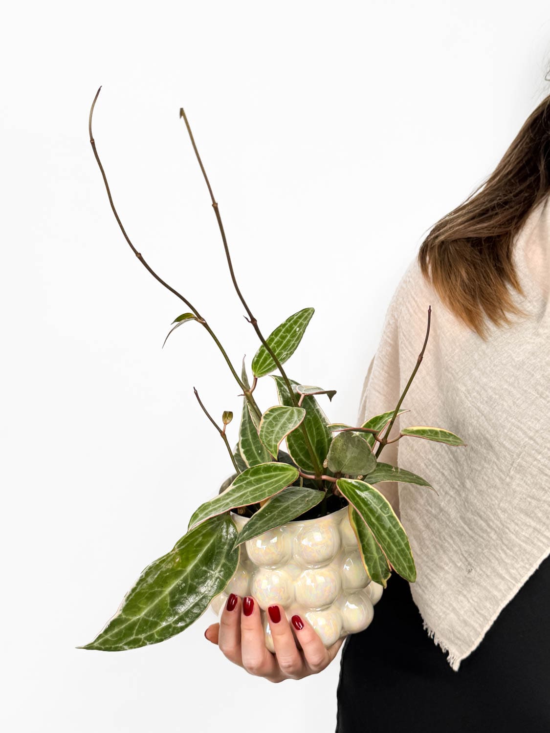 Jsem voskovka ‚Albomarginata‘ (Hoya latifolia) a jsem opravdu hrdá na své velké, masité listy s jemným bělavým okrajem. Umím v nich skvěle zadržet vodu, takže pár suchých dnů mi rozhodně nevadí. Jsem nenáročná rostlina, a když se o mě budeš hezky starat, můžu kvést téměř po celý rok – moje květy v odstínech růžové a bílé navíc nádherně voní po kokosu a hnědém cukru.