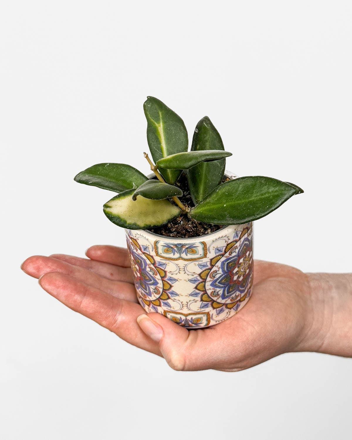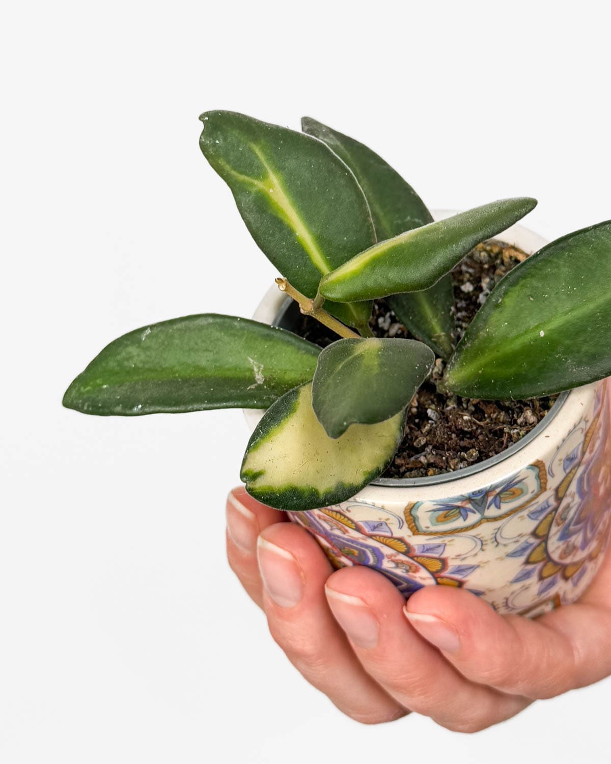 Stejně jako mé příbuzné z rodu Hoya mám voskovité a kompaktní listy, ale mé zbarvení je jedinečné – krémově světle zelený střed lemovaný tmavě zeleným okrajem. Díky své převislé formě budu nejšťastnější v závěsném květináči, kde mohu krásně vyniknout.